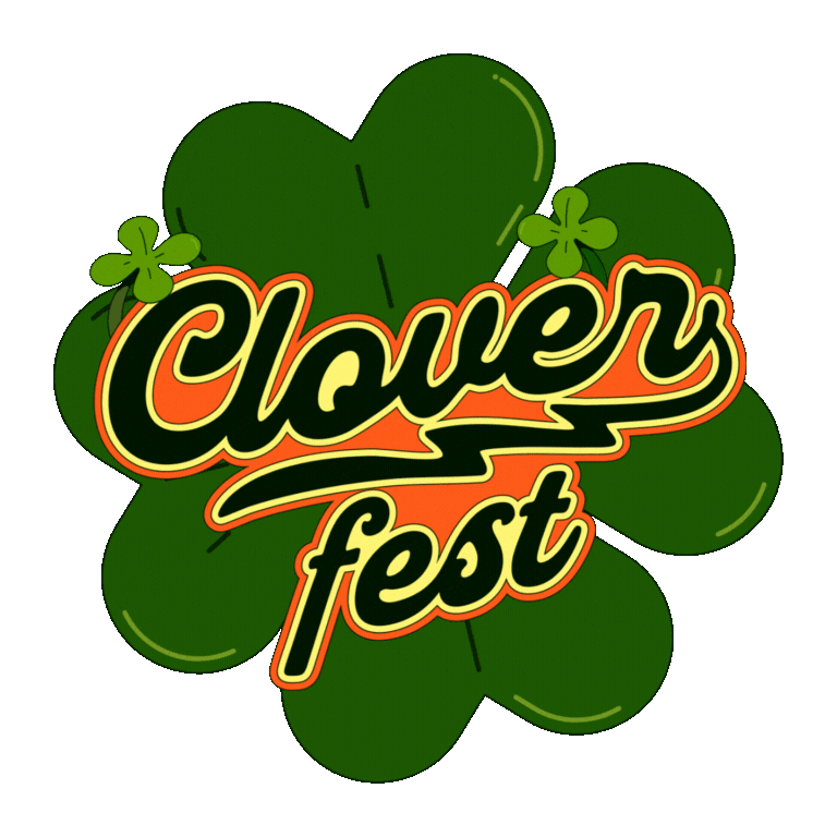 A colorful logo for Clover Fest featuring a large green four-leaf clover with the words 'Clover Fest' written in stylized black and yellow text across the center.